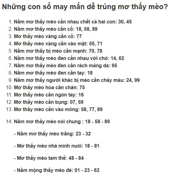 - Mơ thấy bị mèo cắn chân Con số may mắn: 58, 85