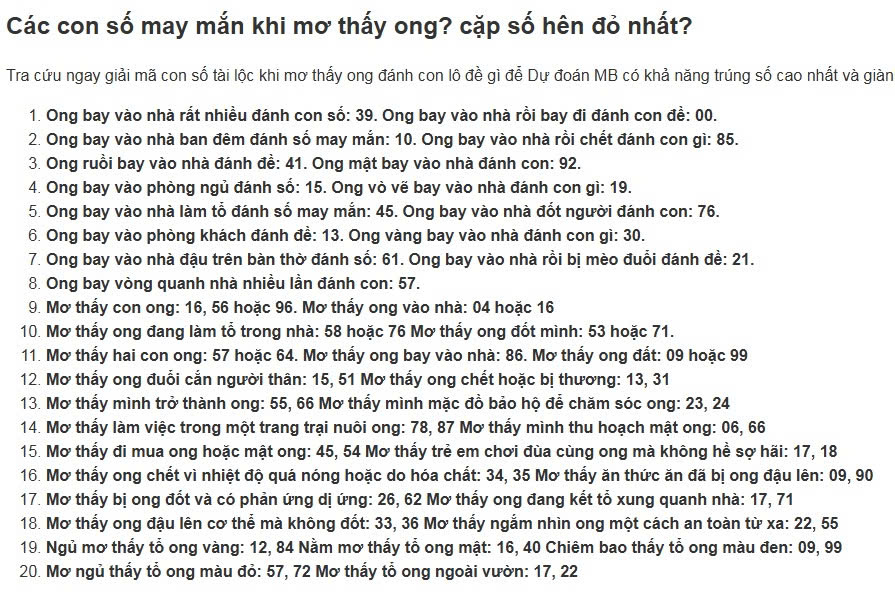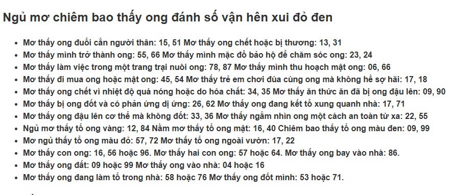 - Mơ thấy ong chết hoặc bị thương: 13, 31 Mơ thấy mình trở thành ong: 55, 66