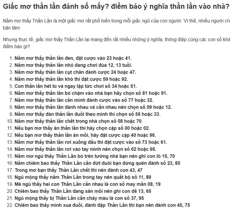 - Con thằn lằn chết trước mặt tôi: 73. Thấy thằn lằn con mới đẻ: 09. Xem đuôi thằn lằn:22.