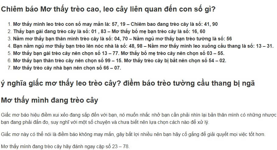 - Mơ thấy mình leo trèo con số may mắn là: 57, 19 – Chiêm bao đang trèo cây là số: 41, 90