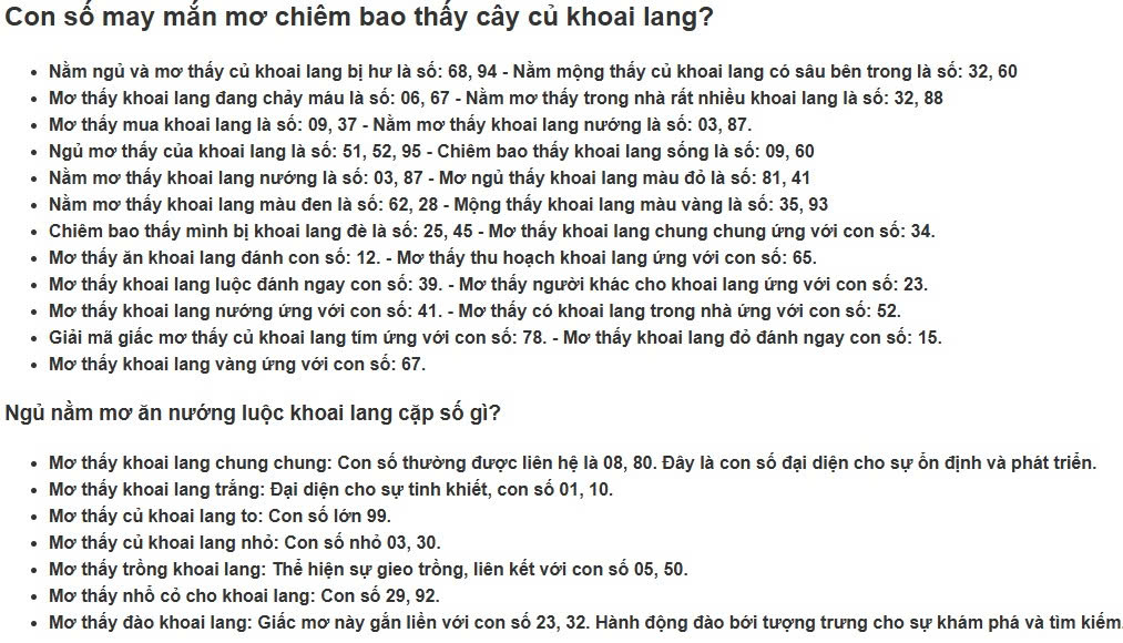 Giấc mơ về khoai lang có thể là điềm báo về tài lộc, sức khỏe, công việc hay các mối quan hệ, đồng thời cũng được nhiều người tin rằng liên kết với những con số may mắn cụ thể cho các trò chơi lô tô, lô đề, sổ xố.