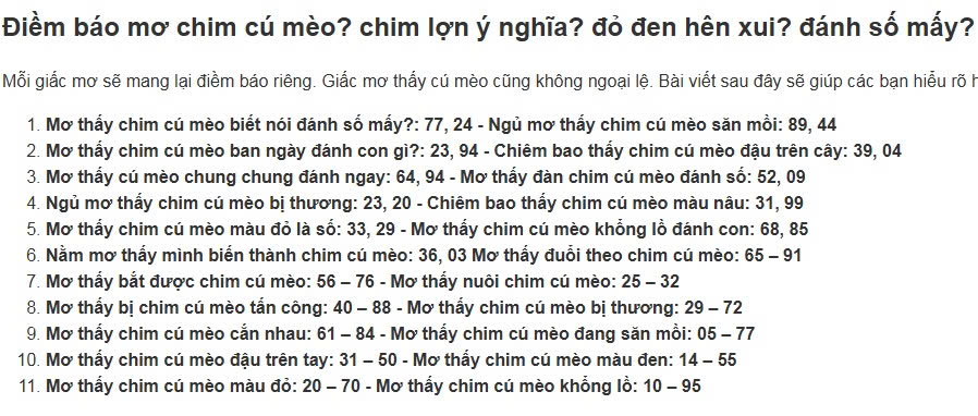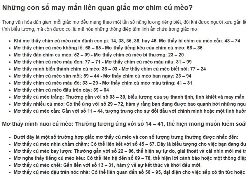 - Chiêm bao mộng thấy bị chim cú mèo cắn chọn con số: 02 – 40 – Mộng thấy tiếng kêu của chim cú mèo dễ thắng đậm với cặp số: 24 – 15